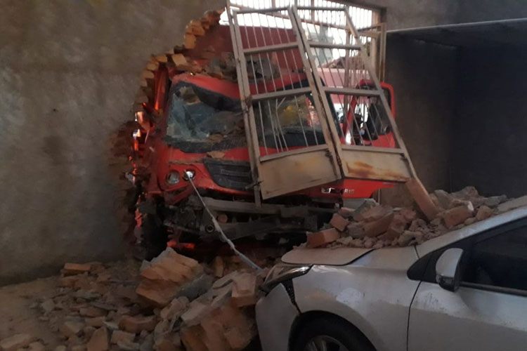 Foto: WhatsApp/Achei Sudoeste Ao passar por um cruzamento, Idalino Batista Santana colidiu fortemente contra um veículo Cruze, licenciado na cidade de Palmas de Monte Alto. Com o impacto, o veículo foi lançado contra uma farmácia, causando diversos danos materiais no estabelecimento. O caminhão também atingiu a grade e parte do muro de um estacionamento privado.