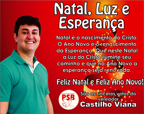 O parlamentar lembrou o nascimento do menino Jesus nessa data tão importante e fez votos de boas festas aos munícipes. No clima natalino, o vereador Castilho Viana (PSB) deseja a todos os brumadenses um Natal de muita luz e um Ano Novo de esperanças renovadas. O parlamentar lembrou o nascimento do menino Jesus nessa data tão importante e fez votos de boas festas aos munícipes.