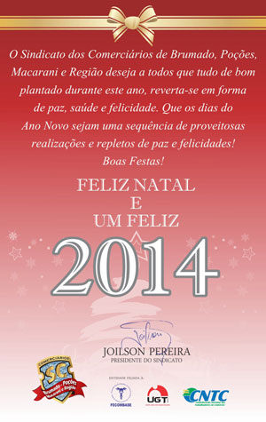 O presidente do Sindicato dos Comerciários, Joilson Pereira, desejou aos brumadenses e demais municípios associados boas festas e que aquilo que foi semeado de bom durante o ano seja revertido nessa época em paz, saúde, e felicidade. Pereira ainda fez votos de um Ano Novo repleto de realizações a todos.